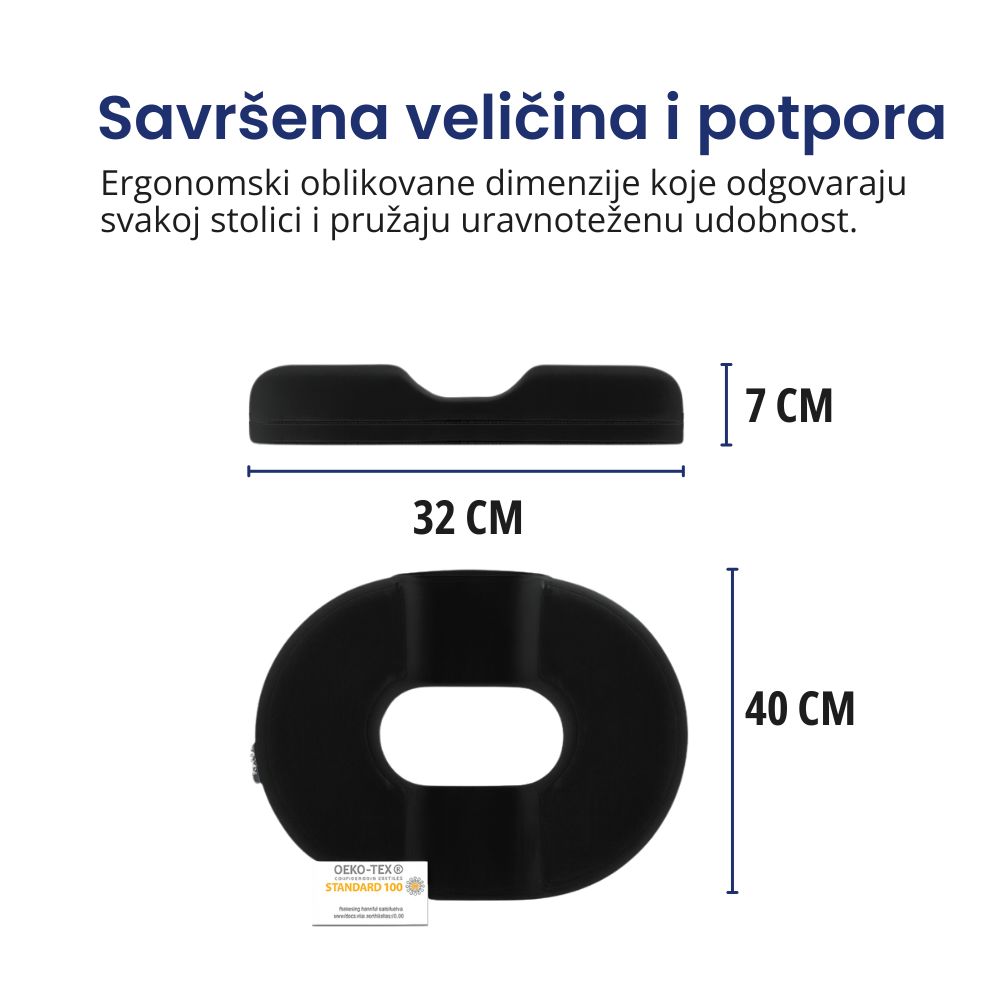 Ergonomski oblik s izrezom smanjuje pritisak na trticu i donji dio leđa, dok memorijska pjena osigurava optimalnu potporu i udobnost. Odvojiva navlaka omogućuje jednostavno čišćenje i dug vijek trajanja proizvoda.